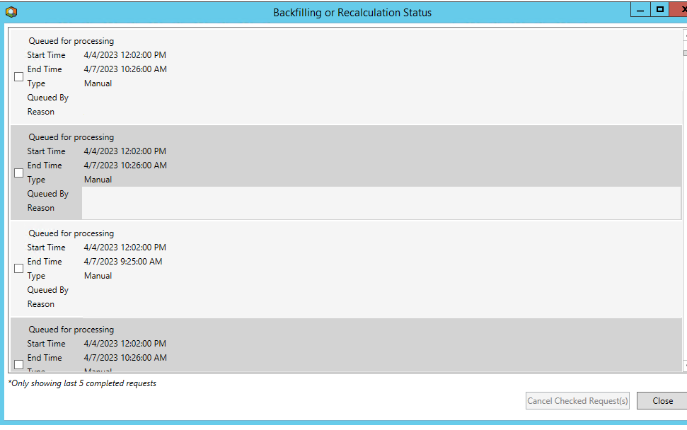 Please refer the screenshot of existing window. There is no option to select multiple checkboxes. If user want to cancel multiple backfilling process which are queued (it was more than 50), then the cancellation option is not available to stop this backfilling process. Please consider this as an enhancement.