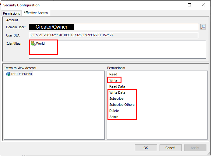 In the Security Configuration Effective Access, the User tested is shown with the Identites it is mapped to, rather than the Identities granting this user rights to the Item being checked.